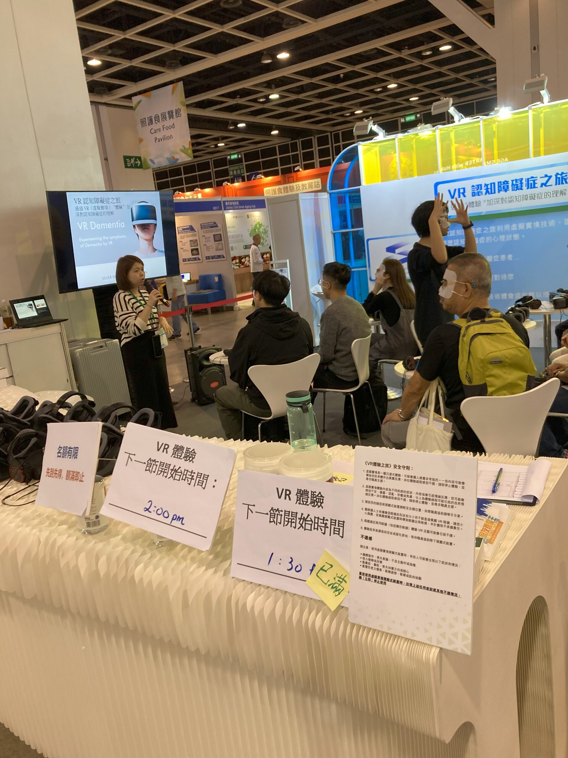 今回は、レビー小体型認知症の方の約7割にあらわれる幻視の症状を一人称体験する「レビー小体病幻視編」と、VRの監修をしていただいたレビー小体病当事者の樋口直美さんのビデオメッセージをご案内しました。20-30分毎に人を入れ替えて体験をしていただきましたが、毎回ほぼ満席で、香港の方々の関心の高さを感じました。
